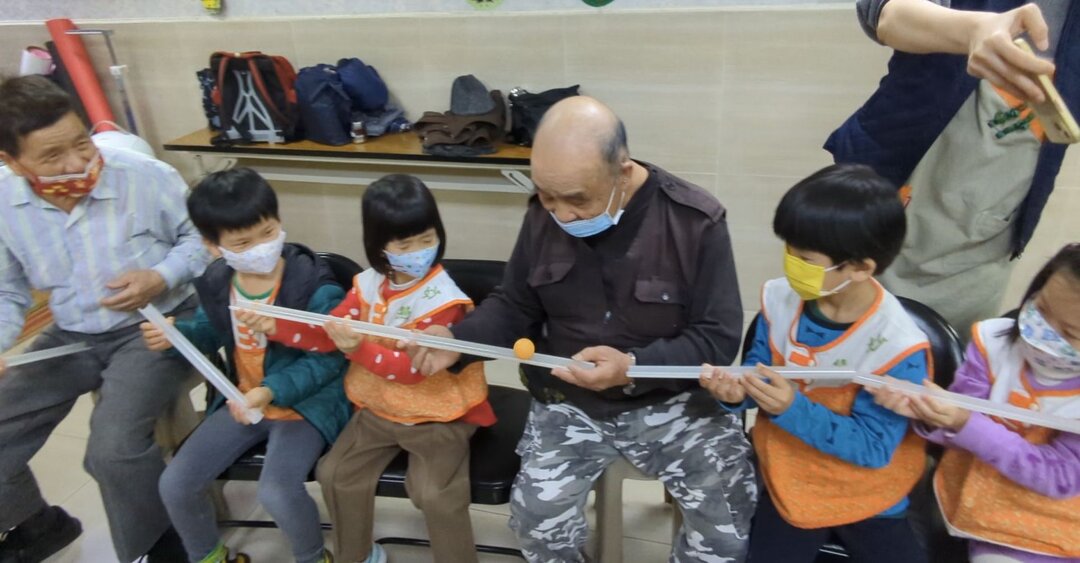 第三個活動是「合作遊戲:塑膠軌道接龍滾乒乓球」。長輩和小朋友們分組,每組共同合作,努力將乒乓球滾到目標位置。雖然過程中有時候會遇到一些困難,常常球會掉下來,但大家都樂在其中,共同努力,最終讓球滾到終點,那份成功的喜悅是無法用言語形容!